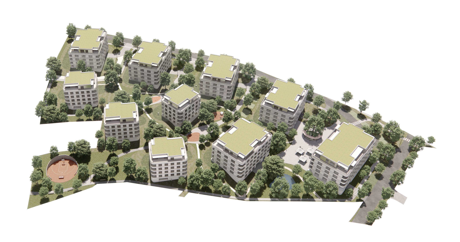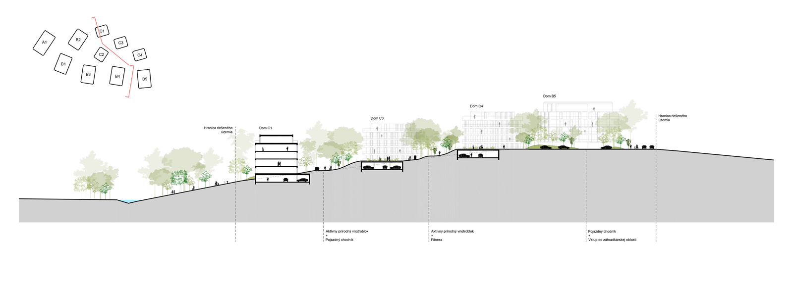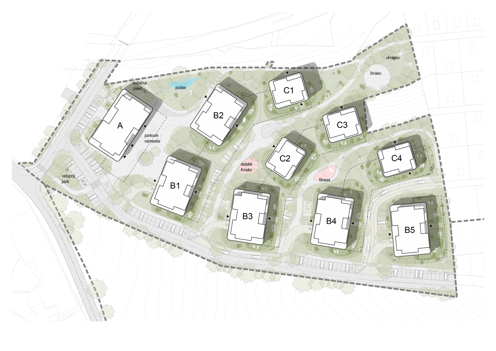 Kľúčovou témou bolo „naťahovanie“ zelene od prírodného prostredia do novonavrhovaného územia bývania. Rovnako aj rešpektovanie súčasného terénu a jeho potenciál na vytvorenie zaujímavého a pestrého prostredia plného priehľadov a prirodzených terénnych situácií.